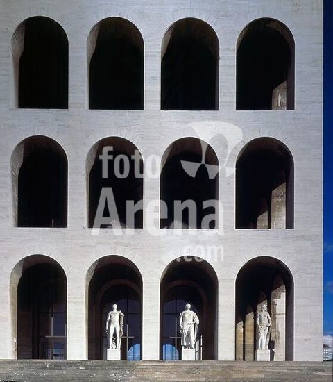 akg897069 Rome (Latium, Italy), Quartiere dell'EUR, Palazzo della Civiltà del Lavoro (built 1938-43; architects: Ernesto Bruno La Padula, Giovanni Guerrini and Mario Romano).-Partial view: west fac ade.-Photo, 2002.