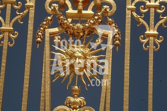 akg927252 Versailles (France), palace / Château de Versailles, grille royale / fence grill between Cour des Ministres and Cour Royale; reconstructed in 2007/ 08 after designs of the original by Jules Hardouin-Mansart, under Freéderic Didier (original destroyed in 1794).--Detail: sun emblem.-Photo, June 2008.