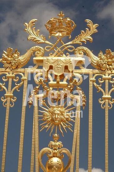 akg927253 Versailles (France), palace / Château de Versailles, grille royale / fence grill between Cour des Ministres and Cour Royale; reconstructed in 2007/ 08 after designs of the original by Jules Hardouin-Mansart, under Freéderic Didier (original destroyed in 1794).--Detail: sun emblem and monogramme of Louis XIV.-/ Photo, June 2008.