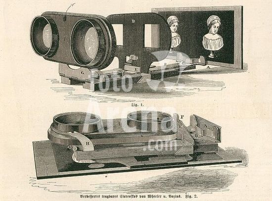 akg121680 Fotografie / Stereoskopie:. "Verbessertes tragbares Stereoskop von Wheeler u. Bazins". Holzstich. Aus: Illustrirte Zeitung, 45. Bd., Nr. 418, Leipzig, 9. Dezember 1865, S. 418. Berlin, Sammlung Archiv für Kunst und Geschichte. Museum: Berlin, Sammlung Archiv für Kunst und Geschichte.