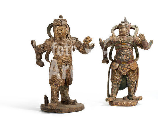 akg7983702 TWO IMPRESSIVE LOKAPALA.China. Ming Dynasty.Wood, carved, one of the figures still with visible residue of the colored lacquer. Inlays in the eyes later. Each warrior is standing in splendid armor in side step. The left hand raised, the right hand stretched out. Both figures with narrow scarves swinging around the shoulder and reaching to the feet. a) Partially good preserved lacquer in red and green with golden details. The helmet in the form of a lion's mask. b) Here the helmet in shape of an animal with a horn, probably a qilin. Hardly any residue of lacquer and parts of the scarf missing. Height a) 111cm, b) 112.5cm. Condition B/C. Art trade, Van Ham.