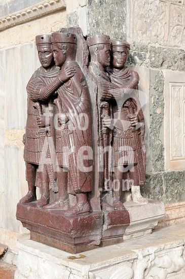 akg1035300 Venedig, Porphygruppe >die Tetrarchen< (Ende 3./Anfang 4.Jh.n.Chr.), wahrscheinlich Darstellungen der römischen Kaisers Diokletian (284-305) und Maximian sowie der Caesaren Constantius Chlorus (Constantius I.) und Galerius an der Kirche San Marco (erbaut 9.-11.Jh.). Italien, Venetien. Venice, at the St.Mark's church, sculpture group >the Tetrarchs