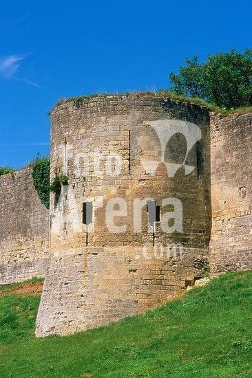 akg1126827 Coucyle-Château-Auffrique (Dép. Aisne, Picardy, France), Castle / Château de Coucy (castle of Barons of Coucy; erected 12th-13th centuries; destroyed in 1652; donjon detonated by German forces in 1917).-Partial view: semicircular tower on the south side of the circular wall of the outer bailey.-/ Photo, undated.