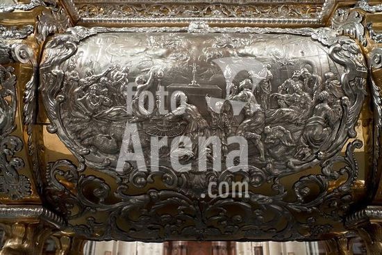 akg1567592 Flämisch, 1643-1644. Schrein der Hll. Bischöfe Cornelius und Cyprianus; Ausschnitt: Kranke werden wundersam geheilt. Szene auf einer Längsseite des Schreins. Eichenholz, Kupfer, Silber. Ninove (Prov. Ostflandern, Flandern, Belgien), ehem. Abteikirche Mariä Himmelfahrt. Foto, 27. Oktober 2010.