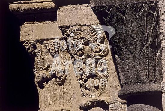 akg372778 Santiago de Compostela (Galicia, Prov. La Coruña, Spain), church Santa María la Real de Sar. (completed before 1172), cloisters (sculptures from the workshop of Master Mateo). Partial view: capital. Photo, undat.