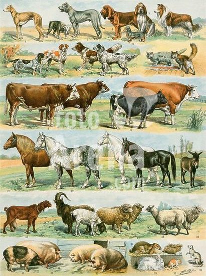 akg1729408 Dogs, cats, cattle, horses, goats, sheep, hogs, and other domesticated animals.|Lithograph, 19th century.
