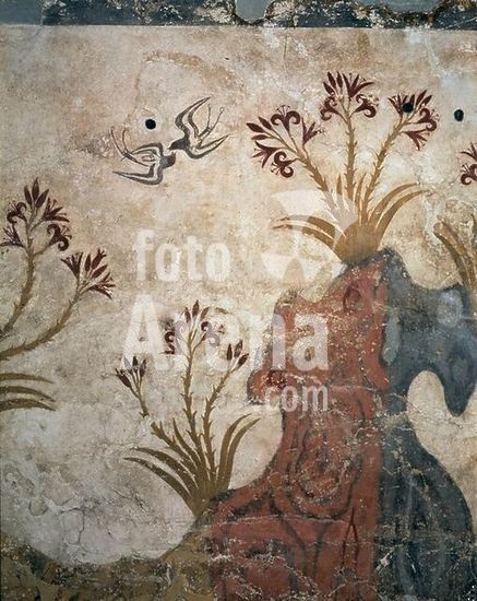 akg220444 Late Minoan, 16th Century BC. Spring landscape; detail: Rock with lilies and a couple of swallows. Fresco. From: Santorini, Thira. Athens, National Archaeological Museum. Museum: Athens, National Archaeological Museum.