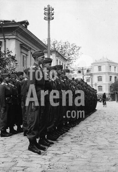 akg237922 World War Two / Balkans 1941:. Occupation of Greece 6 to 29 April, taking of Crete, 20.5. 1.6.1941. - German paratroopers company waiting in Bulgaria before the attack: an assembled unit. Photo fr. photo album "Kreta, Bildbericht einer Fallschirmjäger-Kompagnie", 1941.