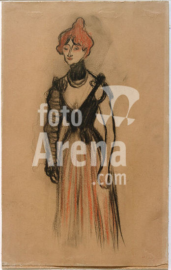 akg3004320 Yvette Guilbert. French singer. Paris, 20.1.1865 - Aix-en-Provence 2.2.1944. - "Cafe Concert Singer (Yvette Guilbert)". - Drawing, Paris, 1901, by Pablo Picasso (1881-1973). Coal and colored pencils on paper, 21 × 12,5 cm. Barcelona, Museo Picasso. Museum: Barcelona, Museo Picasso. Copyright: This artwork of Picasso is not in the public domain. It is your responsibility to obtain all necessary third party permissions from the copyright handler in your country prior to publication.