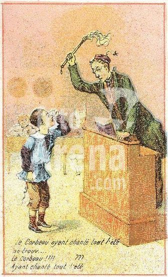 akg3091599 Education / Ecole. - "Le Corbeau ayant chanté tout l'été (...)". - (Un élève s'embrouille en récitant la fable de La Fontaine "La cigale et la fourmi" et est puni par l'instituteur. Lithographie couleur anonyme non datée, fin 19e siècle. 10,2 x 6,4 cm. Image de collection. Collection particulière. Museum: PRIVATE COLLECTION.