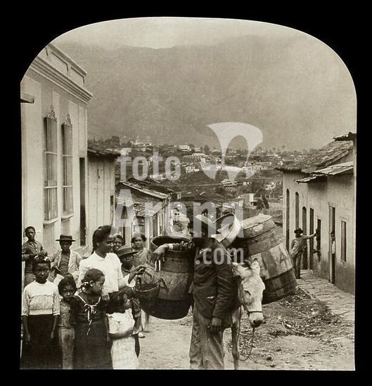 akg3110437 Völkerkunde / Südamerika / Venezuela. - "The City Baker Making His Daily Rounds, Caracas, Venezuela". - (Brotverkäufer mit Maultier in den Straßen von Caracas). Foto (Teil einer stereoskopischen Aufnahme), anonym. Chicago und London (Keyston View Company) o. J. (um 1920), Nr. 13309.. Privatsammlung. Museum: PRIVATE COLLECTION.
