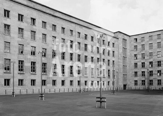 akg358437 Berlin-Mitte, Bundesfinanzministerium (ehem. Reichsluftfahrtministerium, z. Zt. d. DDR Haus der Ministerien, ab 1991 Sitz der Treuhandanstalt, ab 1992 Detlev-Rohwedder-Haus u. ab 1999 Finanzministerium, erbaut 1934-36; Arch.: Ernst Sagebiel). Ansicht der Rückfront. Foto, 2001.