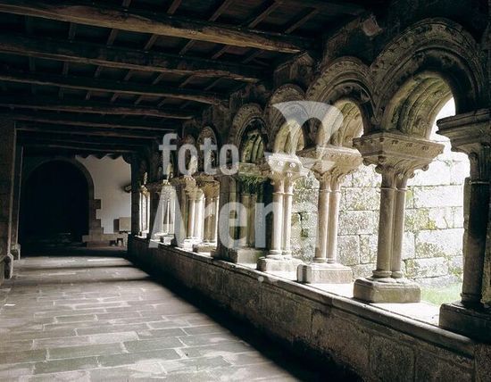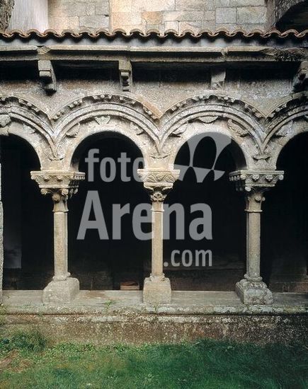 akg372751 Santiago de Compostela (Galicia, Prov. La Coruña, Spain), church Santa María la Real de Sar. (completed before 1172), cloisters (sculptures from the workshop of Masters Mateo). Partial view: arcades. Photo, undat.
