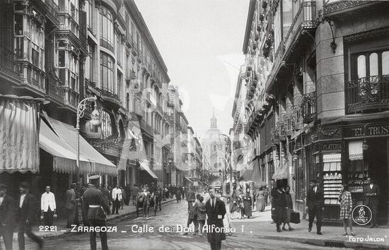 akg390815 Saragossa - Zaragoza (Aragonien, Spanien), Calle de Don Alfonso I. "Zaragoza - Calle de Don Alfonso I.". (Straßenbild mit der Basílica de Nuestra Señora del Pilar im Hintergrund). Fotopostkarte (Foto Jalon), undat. (um 1925?). Aus einem privaten schwedischen Reisetagebuch von 1929.
