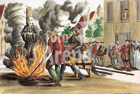 akg405508 Opposition unter Führung des Don Juan Jose de Austria gegen den österreichischen Jesuitenpater und General-Inquisitor Nithard, 1669. / - "Studenten zu Saragossa verbrennen das Bild des P. Nithard". Radierung, vor 1708, von Romeyn de Hooghe (1646-1708). Aus:. H.Ludolff, Historische Schaubühne, Frankfurt a. M. 1718. Spät. Kolorierung.