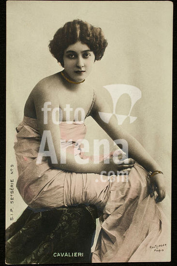 akg4882873 Lina Cavalieri, born Natalina Cavalieri; Italian singer-songwriter (soprano); Viterbo 25. 12. 1874 - Florence 7. 2. 1944. - "Cavalieri". - (Lina Cavalieri, sitting, in a shoulder-free wrapping). Publicity photo postcard, photo: Léopold-Émile Reutlinger (1863-1937), Paris, (around 1905). Private collection.