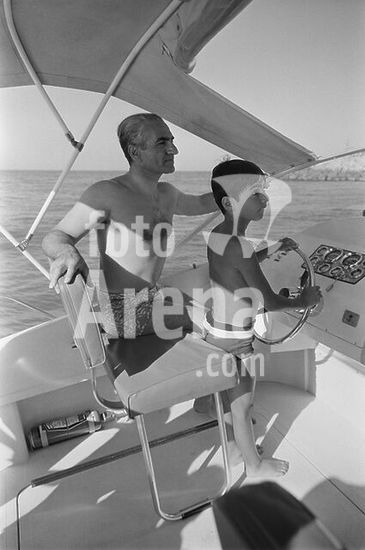 akg5195062 Mohammed Resa Pahlewi (Mohammad Reza Pahlavi), Schah von Persien (1941-80; ab 1967 mit dem Titel Schahinschah). 1919-1980. - In der Sommerfrische in Noshahr am Kaspischen Meer: Der Schah mit seinem Sohn Kronprinz Cyrus Resa in einer Yacht. - Foto, Juli 1970. Copyright: For editorial use only.