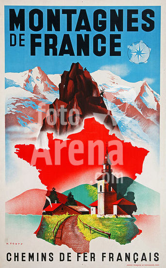 akg5540026 Frankreich / Tourismus. - "Montagnes de France / Chemins de fer français". - (Umriss Frankreichs mit Ansicht eines Bergdorfers und alpiner Bergwelt mit Bergsteigern). Plakat, 1937. Werbung der französischen Eisenbahngesellschaften Chemins de fer français für Bahnreisen in die Berge. Farblithografie, 100 x 62 cm. Grafische Gestaltung: Max Ponty (1904-1972). Druck: Agence Française de Propagande, Paris. Privatsammlung.