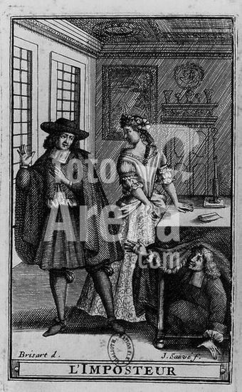 akg560944 Molière, Jean Baptiste Poquelin, dit ; auteur dramatique et comédien français ; 1622-1673. Oeuvre : Le Tartuffe ou l'imposteur (comédie ; 1re 1664/1667). Orgon est témoin de l'entreprise de séduction de sa femme Elmire, par Tartuffe. Gravure sur cuivre, de Jean Sauvé (actif 1660/91) d'ap. dessin de Pierre Brissart. In : Oeuvres de Molière, 1682. Paris, Bibliothèque Nationale. Museum: Paris, Bibliothèque Nationale.