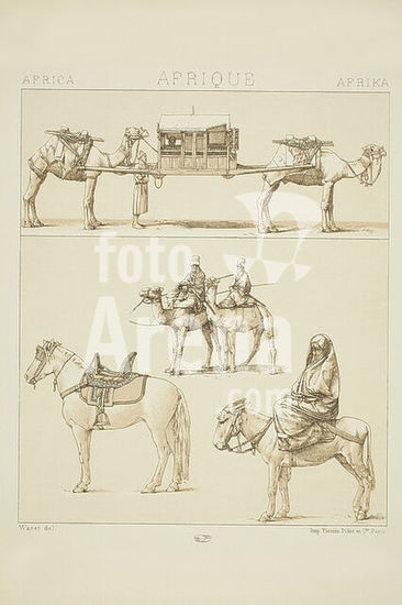 akg5862565 Ethnology / North Africa. - "AFRIQUE / Part septentrionale. Les montures et les animaux de transport. Le Touareg, Une femme égyptienne en costume de ville" (Africa, Northern part, riding and pack animals, The Tuaregs, an Egyptian woman in street costume). - Lithograph from Waret after photographs. Print: Firmin-Didot et Cie., Paris. From: A. Racinet (Auguste Racinet, 1825-1893), Le Costume Historique, Cinq cents planches (...), Types principaux du vêtement et de la parure rapprochés de ceux de l 'intérieur de l'habitation dans tous les temps et chez tous les peuples, avec de nombreux détails sur le mobilier, les armes, les objets usuels, les moyens de transport, etc., Paris (Librairie Firmin-Didot et Cie.) 1888, Volume III, Plate 149. Private collection.
