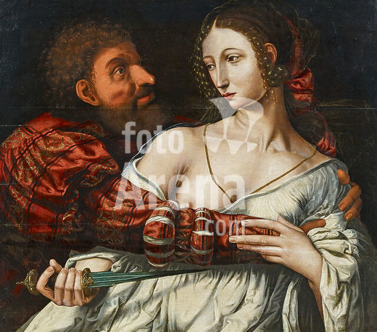 akg7927257 EMESSEN, JAN VAN1500/04 Hemiksem/Antwerp - 1566/75 HaarlemCircleLucretia and Tarquinius. Oil on wood. Parquetted. 74 x 98cm. Framed.
