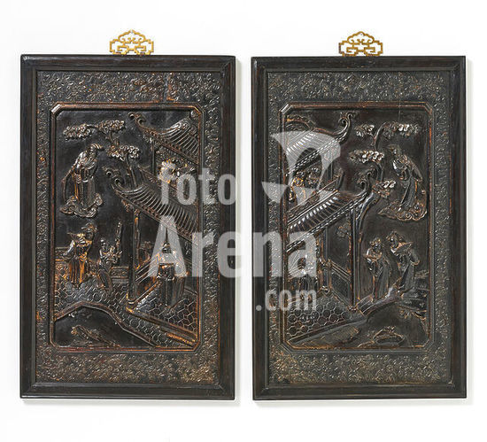 akg7957444 A PAIR OF PANELS WITH SCENES FROM A NOVEL.China. 18th/19th c.Dark wood with residue of gold powder. 63x40cm. Conditon A/B. Supplement: With brass hangers.