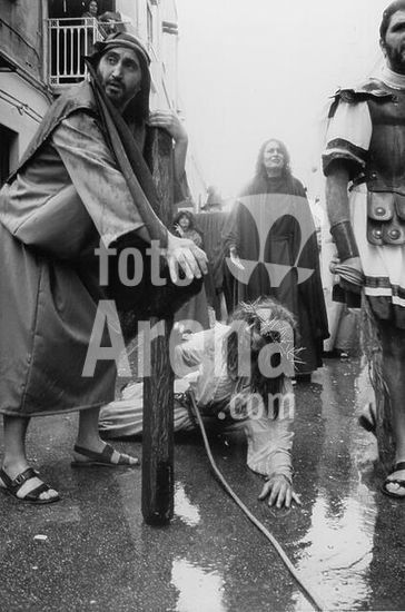 akg817173 Religion / Kath. Kirche / Prozession. "Processione del Giovedi Santo" (Gründonnerstagsprozession in Marsala, Sizlien, seit 1755. Die Kreuzwegstationen werden in lebenden Bildern nachgestellt): Christus stürzt unter dem Kreuz und Simon von Kyrene trägt des Kreuz. Foto, 12. April 2001.