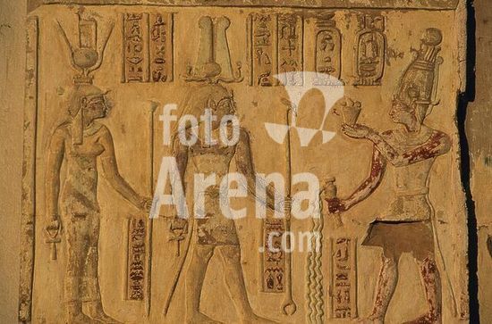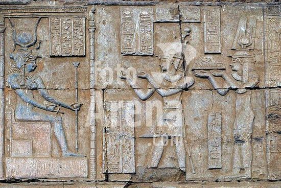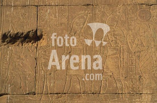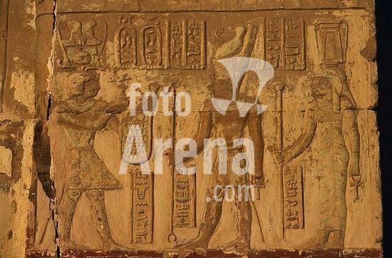 akg895861 Ägyptisch, ptolemäiache u. römische Zeit.-Relief mit Darstellung des Krokodilgottes Sobek und des falkenköpfigen Haroeris links und rechts von zwei Kartuschen.-Kom Ombo, Tempel (Doppelheiligtum des Sobek und des Haroeris).