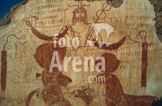 akg999644 Deir el-Hagar (Oase Dachla, Westliche/Libysche Wüste, Ägypten), Tempel der thebanischen Gottheiten Amun, Mut und Chons (römische Zeit, 1.Jahrhundert n.Chr.). /-Wandmalerei mit Darstellung des Amun mit Widdern und griechischen Inschriften.-/ Foto, 2006.