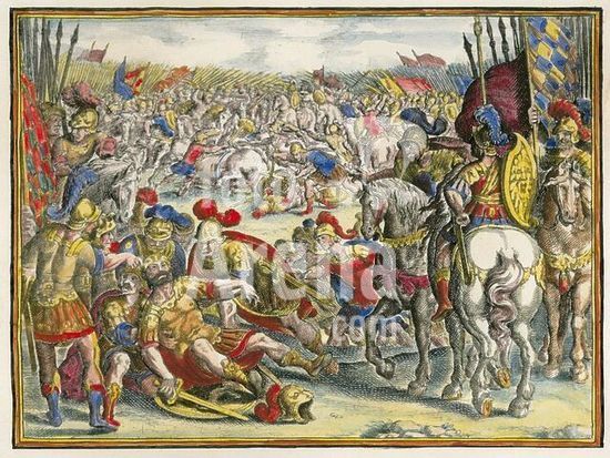akg1150812 Ptolemäus VI. Philometor; ägypt.König der makedon.Dynastie (181-145); gest. 145 v.Chr. /-Ptolemäus Philometor fällt im Kampf gegen seinen Schwiegersohn Alexander Balas bei Antiochia 145 v.Chr.-/ Kupferstich von Matthäus Merian d.Ä.. Aus: Johann L. Gottfried, Historische Chronica, Frankfurt a.M. (M.Merian) 1630. Spätere Kolorierung.