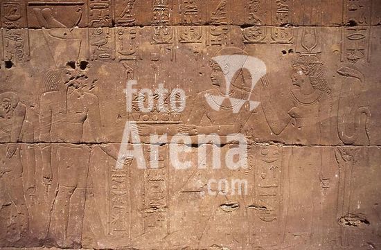 akg999448 Hibis / Hiblet (Oase Kharga/Charga, Westliche/Libysche Wüste, Ägypten), Amun-Tempel (Spätzeit, 26.Dynastie, 6.Jh.v.Chr.; in der Perserzeit unter Darius I. und Darius II. dekoriert; unter Nektanebos I. u.II (30.Dynastie, 4.Jh.v.Chr.erweitert). /-Ausschnitt aus den Reliefs: Horus und Osiris.-/ Foto, 2006.
