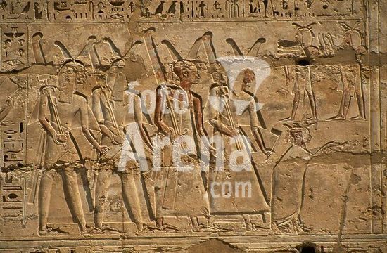 akg1039128 Theben-West (Oberägypten), Medinet Habu, Totentempel Ramses' III. (Neues Reich, 20.Dynastie, um 1160/1155 v.Chr.).-Prozession.-Ausschnitt aus den Reliefs. Foto, undatiert.