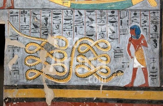 akg1000125 Theben-West (Biban el-Muluk, Ägypten), Tal der Könige, Grab des Haremhab (KV 57).-Darstellung aus dem Pfortenbuch.-Ausschnitt aus der Dekoration der Sargkammer. Wandmalerei, Neues Reich, 18.Dynastie, um 1300 v.Chr.