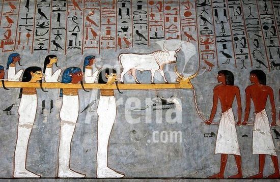 akg941764 Egyptian, New Kingdom, 18th Dynasty, c.1390 BC.--Slaughter of a cow.-Wall painting from the tomb of Nakht (TT 52), necropolis of Sheikh Abd el-Qurna, Thebes (Egypt).