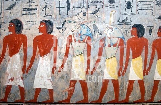 akg941850 Egyptian, New Kingdom, 19th Dynasty, time of Seti I / Ramesses II, c.1290 BC.-Sennedjem in worship of Horus (?) and other Gods: Sennedjem and his wife worshipping the gods of heaven.-Wall painting at the Tomb of Sennedjem, Deir el-Medina (TT 1), West Bank at Thebes (Egypt).