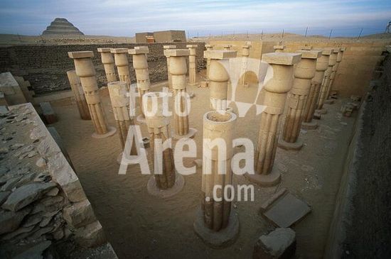 akg999189 Sakkara / Saqqâra (Mittelägypten), Grab des Haremhab (Neues Reich, 18. Dynastie, Zeit Tutanch-Amuns, um 1325 v.Chr.; erbaut für den obersten Feldherrn und späteren Könige Haremhab; freigelegt 1975/76). /-Teilansicht: Säulenhof; im Hintergrund die Stufenpyramide des Djoser.-Foto, undatiert.