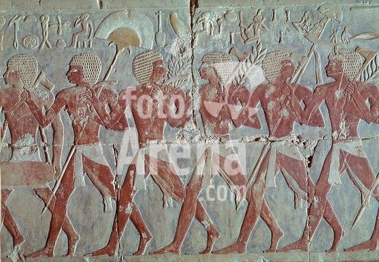 akg1349543 Egypt, New Kingdom, 18th dynasty, c.1470 BC. Mortuary Temple of Queen Hatshepsut.-Soldiers on parade. Detail: Light infantry with battle axes and palm leaves. Relief, painted. Deir el Hahari, west bank of the Nile, Valley of the Kings, Egypt.