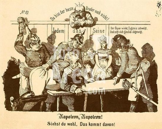 akg1663839 Napoleon III., Kaiser der Franzosen (ab 1851), Paris 20.4.1808-Chislehurst ( bei London) 9.1.1873.-"Napoleon, Napoleon! Siehst Du wohl, das kommt davon!" (Karikatur, anonym, auf die französische Niederlage in der Schlacht bei Sedan 1870).-Flugblatt, Deutschland 1870/1871, Lithographie.