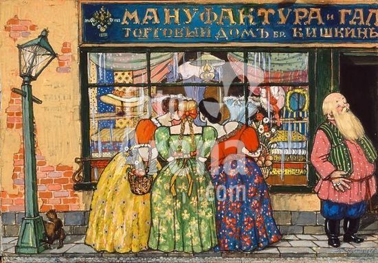 akg1006939 Kustodijew, Boris Michailowitsch 1878-1927. "Am Schaufenster", 1921. Tempera auf Karton, 40,8 x 57,8 cm. Museum: Kunstmuseum der Rep. Kirgisien., BISCHKEK.