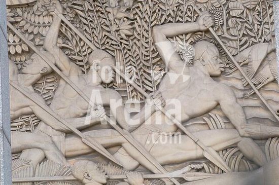 akg423322 Abu Simbel (Upper Egypt), Great Rock Temple (built under Ramses II, New Kingdom, 19th dynasty, c. 1260 B.C.; sandstone. Moved 1964-68 during construction of Nasser Lake and dam). Pillared hall (First Hall): Ramses II battling enemies in his chariot. Relief.