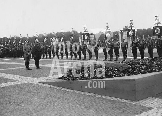 akg1039064 5. Reichsparteitag der NSDAP ("Parteitag des Sieges") in Nürnberg, 1. bis 3. September 1933.-Abschlußveranstaltung mit Aufmarsch von SA und SS im Luitpold-Hain, 3.September: Adolf Hitler (links) und Ernst Röhm während der Ehrung der "Gefallenen der Bewegung".-Foto.
