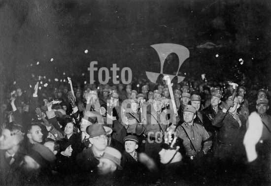 akg986482 Nationalsozialismus / Berlin, 30. Januar 1936: Feiern zum 3. Jahrestag der Machtergreifung.-Nach dem Fackelzug in der Wilhelmstraße:erstmalige Durchführung des "SA-Rufs" anstelle des Zapfenstreiches vor dem Balkon der Reichskanzlei in Anwesenheit Adolf Hitler.-Foto.