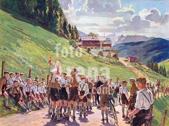 akg1194089 Nationalsozialismus Verbände / Hitlerjugend.-Hitlerjugend auf dem Obersalzberg bei Berchtesgaden mit Haus Wachenfeld (später Berghof), dem Landhaus Adolf Hitlers, im Hintergrund.-Farbdruck nach Aquarell(?), undat. (um 1933).