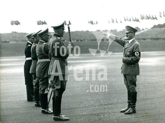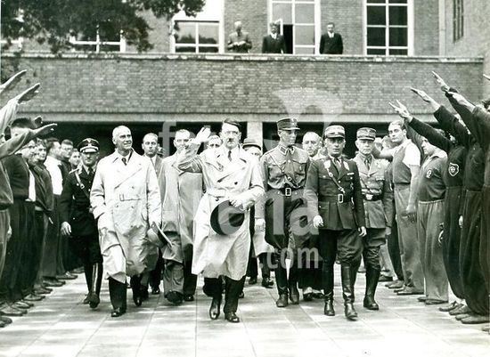 akg1348608 Germany / National Socialism 1933-1945.-8th Nuremberg Rally "Rally of Honour", 8.-14.9.1936, "Day of the Wehrmacht" on 14.9.1936 on Nuremberg's Zeppelin Field: Hitler greets the commanders of the Wehrmacht (from left), Erich Raeder (Navy), Werner von Fritsch (Army), Hermann Göring (Air Force) and Reichskriegsminister Werner von Blomberg.-.