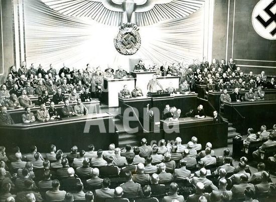 akg1348585 Berlin / Zweiter Weltkrieg / Polenfeldzug der deutschen Wehrmacht, September 1939.-Rechenschaftsbericht Hilers über den siegreichen Polenfeldzug vor dem Reichstag in der Krolloper, 6. Oktober 1939.-Foto.