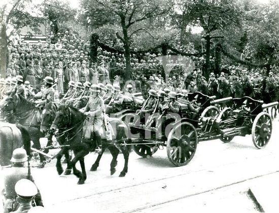 akg1349795 History / World War II / Invasion of Poland 1939, victory paparde of the German 8th Army in Warsaw on 5.10.1939.-Hitler salutes the parade as an artillery regiment marches past.-Photo, 1939.
