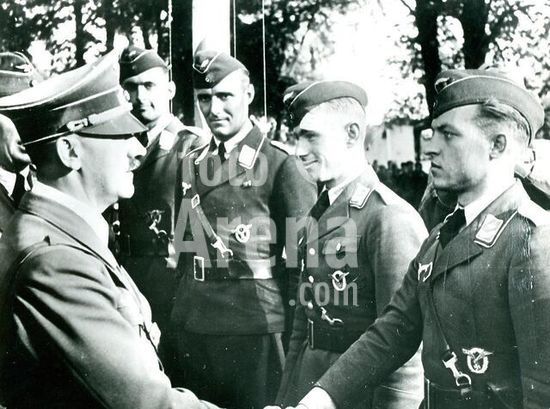 akg1348557 Hitler, Adolf Politiker (NSDAP). Braunau 20.4.1889-(Selbstmord) Berlin 30.4.1945.-Zweiter Weltkrieg: Hitler begrüßt Kampfflieger der deutschen Luftwaffe bei einem Frontbesuch.-Foto, undat.