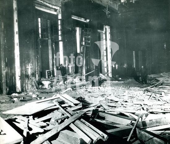 akg1545540 Berlin, Neue Reichskanzlei (1938 erbaut von Albert Speer).-Innenansicht der kriegszerstörten Reichskanzlei nach der Eroberung Berlins durch die Rote Armee: Blick in das Arbeitszimmer Hitlers; links Reste seines Schreibtisches.-Foto, 10. Juli 1945.