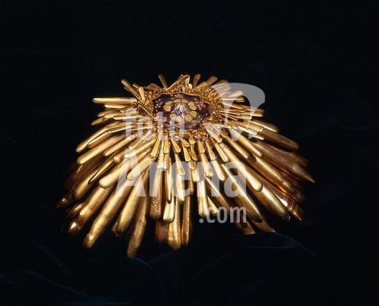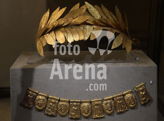 akg6026674 - Etruscan gold crown of laurel4th cent. BCinv. 13380- Etruscan necklace consisting of eleven pendants in stamped gold leaf with crouching sphinxes and women's faces.4th cent. BCinv. 13194Vatican Museums (Gregorian Etruscan Museum)2018.