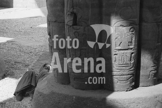 akg916453 Luxor / Luksor / El-Uksur (Oberägypten), Amun-Tempel (Neues Reich, 18.Dynastie; erbaut um 1370 v.Chr. unter Amenophis III., erweitert unter Ramses II. um 1260 v.Chr.).-Teilansicht: Schlafender Aufseher an der Basis einer Säule.-Foto, 1992.